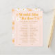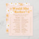 Ajoutez de l'amusement à votre baby shower avec le Pink Spring Baby Personnalisé In Bloom Will She Plutôt Game. Parfait pour les jeux de baby shower, ce jeu vient compléter les thèmes du baby shower printanier et offre des idées uniques de baby shower printanier. Idéal pour un baby shower de printemps, il s'intègre bien avec les idées de baby shower d'avril, les idées de baby showers floraux, le thème du baby shower de jardin et le thème du baby shower fleur sauvage. Célébrez avec bébé en fleurs douches idées, bébé en fleurs thème baby shower, ou un baby shower de marche.