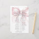 Ce jeu de Fête des mariées de style Coquette Girly et mignonne - Elle préfère. Ajoutez une activité ludique à votre douche nuptiale où les invités devinent quelle option la future mariée choisirait pour une série de questions amusantes "Elle préfère". C’est un moyen léger de susciter la conversation et le rire tout en la célébrant. Le design comprend un arc rose vif surdimensionné qui dérobe le projecteur, associé à l'expression "Elle attache le noeud !" dans une combinaison chic de script manuscrit noir et de polices serif classiques. La typographie améliore le charme de la coquette, mêlant écriture gracieuse et texte serif intemporel pour un look féminin et élégant. Entièrement personnalisable, vous pouvez modifier les questions, les couleurs de police et l'arrière - plan pour correspondre à votre thème de douche nuptiale. Cette activité ajoute une touche douce et ludique à toute célébration.