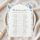 Ajoutez une touche de plaisir douce et élégante à votre douche nuptiale avec notre jeu "Voudriez-vous qu'elle préfère ?" conçu pour correspondre à l'esthétique rêveuse et délicate de votre quelque chose de bleu avant de faire la fête. Doté d'élégantes fleurs de style chinoiserie en bleu poudreuse et blanc classique, cette carte de jeu est aussi belle qu'elle est divertissante. Il se fond harmonieusement dans une salle de douche nuptiale romantique, surtout remplie de sachets de thé vintages, de souffle de bébé et de lumière douce aux chandelles. Imprimé (ou téléchargé) sur un stock de carte de haute qualité ou affiché numériquement, ce jeu est une adorable activité qui fait rire et deviner les invités. Va-t-elle choisir le café plutôt que le thé ? Montagnes ou plage ? Danser toute la nuit ou une soirée cosy ? Les invités font le tour de leurs devis et tentent d’égaler les préférences de la mariée, une combinaison parfaite de personnel, de jeu et de coeur. Le design lui-même est intemporel, avec des fleurs bleues foncées le long de la frontière et un agencement minimaliste mais romantique, il améliore n'importe quel paysage de table ou d'accueil. Il ne s’agit pas seulement d’un jeu, mais d’une partie de l’ensemble de l’aspect et de l’ambiance de votre événement, qui s’inscrit dans l’esthétique de la douche nuptiale avec un charme sans effort. Que vous planifiez un thé de l'après-midi intime ou une fête dans le jardin extérieur, ce jeu Will She Plaise s'intègre parfaitement. Il encourage la conversation, ajoute du rire, et donne à la mariée un moment pour briller tandis que tout le monde essaie de comprendre ce qui la fait marcher. Pour un look cohésif, associez-le avec des menus assortis, des étiquettes de faveur, des panneaux et d'autres décors imprimables qui donnent vie à votre vision "Quelque chose de bleu".