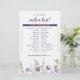Feuille de jeu de Fête des mariées Florale Violet Personnalisée : Voulait-Elle Plaire? Qui connaît le mieux la mariée ? Jouez à ce jeu avec vos invités de douche nuptiale, et découvrez qui la connaît le mieux? Vous pouvez modifier toutes les questions sur ce sujet pour le personnaliser à la mariée ! Vous pouvez même le changer pour en faire un jeu de douche de couple en changeant le "elle" en "eux". Demandez à vos invités de trouver leurs réponses exactes...l'invité avec les victoires les plus correctes ! Ce design présente des fleurs sauvages violets et lavande avec de la verdure. Cliquez sur "Customiser plus loin" pour modifier plus en détail.