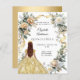 Un arrière - plan blanc. Décoré de fleurs blanches et jaunes, vert sauge et ruban doré. Une fille portant une tiare et une robe. Personnalisez et ajoutez un nom et des détails. Retour : un arrière - plan d'or. 1 feuille = 1 invite imprimé bord à bord.