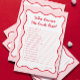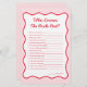 Faites de votre événement un événement inoubliable avec le Red Pink Personnalisé qui connaît Bride meilleur jeu de Fête des mariées! Parfait pour les valentines des idées de douches nuptiales ou un thème de douches nuptiales valentines, ce jeu ajoute du plaisir à un baiser la fête de l'adieu manqué ou une cerise sur le thème de la douche nuptiale. Avec un thème mariage rouge et rose, il est idéal pour l'amour dans les idées de douche nuptiale à l'air, bu dans l'amour, ou un soda dans l'amour thème de douche nuptiale. Aussi idéal pour les valentines idées mariages, une Vegas Bachelorette Party, chanceux en amour bachelorette, ou un thème de bachelorette parfait match!