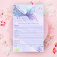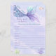 "Une douce petite sirène est en route", soirée "Under the Sea" sur le thème de la petite fille baby shower. Aquarelle aux teintes violettes et bleues pastel, avec la queue joueuse de sirène, le poisson clown et les coraux. Réponses : CRAVINGS, PLEIN, PACIFICATEUR, BOUTEILLE, LUMIÈRE NOCTURNE, LULLABY, STROLLER, ÉPIDURAL, BRÛLE, CHAISE HAUTE, SAC DE DIAPER, ÉPONSE
