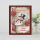 This holiday scrapbook paper features a snowman in a black top hat, wearing a red scarf, as the main element on a junk journal page. Flowers, snowflakes, and gold filigree, with text, complete the page. The back is dark wine-red, with snow falling across it. Very beautiful and festive, and perfect for your holiday memories!