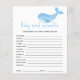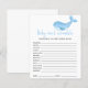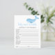 Un petit en chemin avec cette invitation au baby shower sur le thème de la mer, avec baleine à bébé dans des aquarelles bleu doux. Réponses : CRAVINGS, PLEIN, PACIFICATEUR, BOUTEILLE, LUMIÈRE NOCTURNE, LULLABY, STROLLER, ÉPIDURAL, BRÛLE, CHAISE HAUTE, SAC DE DIAPER, ÉPONSE