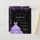Une invitation moderne, élégante et glamour pour une fête Sweet 16, 16e anniversaire. Un arrière - plan noir chic avec de la poussière de parties scintillant violet et une robe. Le nom est écrit avec un script de style moderne écrit à la main. Personnalisez et ajoutez les détails de votre fête.