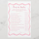 Ajoutez du plaisir à vos jeux de douche nuptiale avec ce jeu personnalisé Wavy Pink Over Under Fête des mariées, parfait pour un lien le thème de la douche nuptiale de noeud ou cravate les idées de douche nuptiale de noeud. Ce jeu complète un thème de douche avant-nuptiale avec des idées de douche avant-nuptiale stylisées pour une charmante fête avant. Célébrez avec le thème de la douche nuptiale hors du marché et l'amour est en fleurs thème de la douche nuptiale pour faire des souvenirs inoubliables!