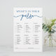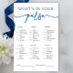 Un jeu de douche nuptiale amusant et interactif qui permet à chacun de fouiller dans ses sacs ! Le jeu imprimable What’s In Your Purse présente sous la forme d’un design moderne "quelque chose de bleu" avec des valeurs numériques hiérarchisées pour maintenir la concurrence vivante. Les clients vérifient les objets qu'ils ont dans leur sac à main et font le décompte de leurs points. Celui qui a le total le plus élevé gagne ! Un complément parfait à votre élégant thème de douche nuptiale bleue.