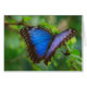 Un superbe papillon bleu Morpho au repos sur une branche verte et feuillue.