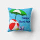 Un coussin personnalisé avec des lettres rétro en bleu et une illustration amusante sur le thème de la plage ou de la piscine avec un ballon de plage rouge, un parasol vert, des sandales de vacances et de l'huile solaire sur un fond de bleus clairs et de vagues ondulées. Cliquez sur Personnaliser pour changer les polices, les couleurs de fond et plus encore.