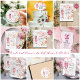 Een elegant ontwerp met stoffige roze parels, blozende rozen, vlinders en een glas prosecco. Je kan dit personaliseren met je eigen details.