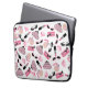Een elektronicazak met een ontwerp bestaande uit roze en zwarte retro zonnebrillen voor katten, roze verversingspursen met grijze polka-stippen, roze verbindingspasjes met zwarte boog, roze lippenstiften, roze gemulten en een flesje met roze atomisator.