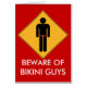 Silhouette van een man in een rode bikini op een geel diamantvormig teken en tekst Let op van Bikini-jongens.