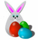 Grappig konijn met kleurrijke eieren om Pasen te vieren. Cute gift, kunt u het als fotobeeldhouwwerk, magneet, speld, ornament en sleutelhanger kiezen.