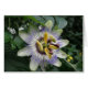 Dit wenskaart bevat een zeer gedetailleerde foto van een mooie en exotische passionbloem. De foto werd genomen met behulp van macrofotografie, wat resulteerde in een afbeelding dat zo gedetailleerd is dat je elk individu kan zien in een randblad. De kleuren in het afbeelding zijn helder en levendig.