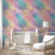 Dit behang heeft wervelingen van pastelkleuren in roze turquoise, oranje en gele tinten, met hemelse gouden accenten.