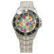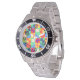 Dit mannen horloge heeft een Bauhaus ontwerp van vierkanten met vreemde vormen binnen, herhaald over het ontwerp.