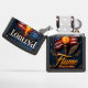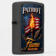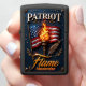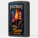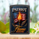 This incredibly patriotic image showcases a custom, matte black rectangular case featuring a powerful and symbolic graphic. The artwork centers on a vibrant, waving American flag on a flagpole, dramatically lit by a glowing flaming torch. A stylized quill, symbolizing the spirit of liberty and the Constitution, rests against the torch. The dark blue background is adorned with scattered stars and subtle golden olive branches, and the composition is framed by an ornate, dark metallic border. The word "PATRIOT" is displayed at the top. This design features a highest quality print; the overall look powerfully embodies national pride. The text "Flame" and "Alexander" are featured at the bottom, and the lighter case comes in 12 colors.