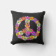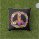 Een bloemig vredesteken in tinten van roze, geel, sinaasappel, paarse, groene, witte en zwarte vormt het middelpunt op dit boho chique werpkussen.