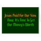 Si Jésus payait déjà nos péchés nous pourrions aussi bien obtenir la valeur de notre argent. "Jésus a payé nos péchés. Maintenant il est temps d'obtenir la valeur de notre argent."