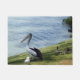 In de rivier zijn baby eenden met moeder en vader, een pelikaan en twee zeegarens afgebeeld.