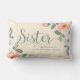 Deze stijlvolle kussen hebben een zachte perzikachtergrond met subtiele witte poka stippen, en trendy perzik en witte bloemen met veel groene bladeren. Het woord "zus" staat in een mooi handgeschreven script en er is een plek om je te personaliseren met jouw naam.
