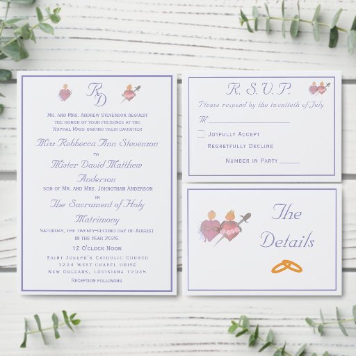 Periwinkle Two Hearts Catholic Wedding Invitation