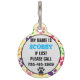 Koel aanpasbaar label voor uw hond of kat.Schrap de getoonde naam en voeg uw huisdiernaam en uw telefoonnummer in hoesje toe zij worden verloren.Het ontwerp omvat fancy tekst en koele kleurengrafiek die u van zult houden! Zie ook het bijbehorende ontwerp met roze tekst voor je meisje hond of kat!