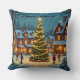 A serene winter scene at dusk featuring a large, festively decorated Christmas tree in the center of a snowy town square, surrounded by several red gift boxes with white ribbons. The tree is adorned with red and white ornaments and illuminated by yellow lights, topped with a bright yellow star. Four children on ice skates are positioned around the tree, dressed in warm winter attire including red, green, and brown coats and hats. Two large, brown houses with snow-covered roofs and chimneys are visible in the background, with warm yellow lights glowing from their windows. The houses are flanked by snow-covered trees and bushes, with bare trees on either side of the image. The sky above is a deep blue with a few clouds, and the atmosphere is peaceful and festive.