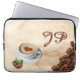 Featuring a soft coffee-colored background, scattered coffee beans, a steaming cup of coffee, and customizable owner initials, this sleeve is perfect for coffee lovers who want their laptop to reflect their personality.