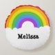 Dit ronde kussen of kussen is klaar om te worden gepersonaliseerd met jouw naam of andere tekst. Het heeft een afbeelding van retro stijl regenboog in felle kleuren met jouw naam in vet zwart opschrift in de witte wolken.