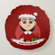 Coussin ronde avec l'illustration d'une jolie fille souriante avec de courts cheveux noirs, elle porte un costume de Père Noël rouge et blanc et tient un cadeau; avec le modèle texte modifiable pour votre nom ou message, Noël design avec un arrière - plan rouge