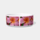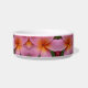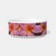 Deze keramische huisdierenbak heeft bloesems van een roze plumeria, geurloze Hawaiiaanse bloem die vaak in een lei wordt gevonden. Het herhaalt bijna helemaal rond het gerecht.