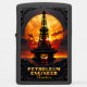 This dark, high-contrast, and dramatically framed design is a commanding tribute to the Petroleum Engineer or Offshore Rig Operator whose workplace is the powerful, open ocean, drilling deep into the earth's core. The central image features a colossal oil or gas platform silhouetted directly in front of a massive, vibrant orange and red setting sun or rising moon. The fiery orb and dramatic clouds provide an intense backdrop for the dark, towering structure. The entire scene is framed by a heavy, ornate, dark metallic border with rich, black sculptural detailing, creating a sense of drama and structural strength. This visual powerfully symbolizes the raw, deep-seated energy being extracted, the isolation and magnitude of the offshore operation, and the professional skill required to command this vital infrastructure against the backdrop of natural power. The bold, golden text "PETROLEUM ENGINEER" is clearly displayed in a prominent banner, honoring the dedication required to manage this high-stakes maritime industry.