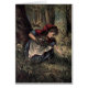 Peu de cueillette de capuchon de rouge fleurit pour sa grand-mère. Le loup sournois est fonctionnement vu dans la forêt dans la distance.