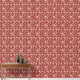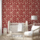 Behang in een William Morris, Art Nouveau patroon van fazanten en hazen tussen bladeren, wijnstokken en bloemen - crème / winter wit op een diep Chinese rode achtergrond