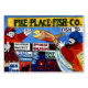 Een kleurrijk schilderij van de Pike Place Fish Company in de Pike Place Market.