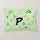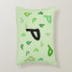 Zwarte letter in grote hoofdstad, zit in het midden van kleinere letters die ronddraaien. Voor de groene letters worden verschillende groene tinten en verschillende maten gebruikt. Achtergrond is bleek groen.