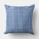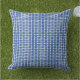Donkerblauwe "thread"-vierkantjes zijn getild om een losjes geweven patroon aan de voor- en achterkant van de kussen te geven.