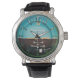 De Altimeter-polshorloge van de piloot heeft een klokgetal van 24 uur op een blauwe en zwarte achtergrond. De hoogtemeter werkt niet, maar de polshorloge van deze fantastische aviator wel.