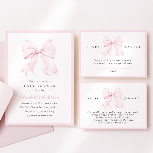 Sweet baby shower invitation that features an elegant pink bow. Choose the scallopped edges for a whimsical finish.