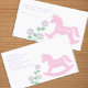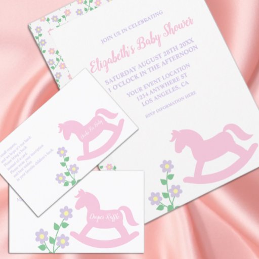 Pretty pink rocking horse with shades of pink and purple next to fun flowers