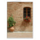 La fenêtre arquée en bois a placé dans un mur de briques rouge toscan avec des fleurs à la fenêtre et à un pot de poterie de terre sur la cour ci-dessous
