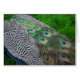 Photographie originale du dos d'un paon, montrant le début de la queue, avec les plumes distinctives de vert magnifique et du bleu.