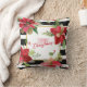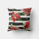 Coussin rayé noir et blanc "Joyeux Noël" avec des poinsettias rouge, ivoire et vert avec feuillage vert et pinecones pour décorer votre maison pour les vacances.
