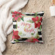 Coussin rayé noir et blanc "Joyeux & Lumineux" avec des poinsettias rouges, ivoire et vert avec feuillage vert et pinecones pour décorer votre maison pour les vacances.