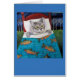 Le chat tigré gris s'étend dans le lit pendant la nuit avec ses pattes se reposant placé sur tourné en bas de la feuille, yeux grands ouverts. Son édredon est rempli d'images des poissons de natation