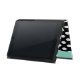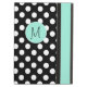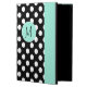 Stijlvol hoesje met iPad Air-bladerstijl met ingebouwde standaard in een zwart-wit poka dot. Een mint groene band, die langs de rechtervoorkant loopt en een decoratieve munt groene schijf, aan de middelste voorkant, heeft een zwart 1 letter monogram klaar om zich te personaliseren. Maakt een geweldig gepersonaliseerd cadeauidee.