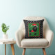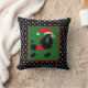 Moderne en feestelijke werpkussens zijn voorzien van zwarte en witte polka stipachtergrond met zwarte pooe in een kersthoed en een zweet in een vierkant met groen midden.