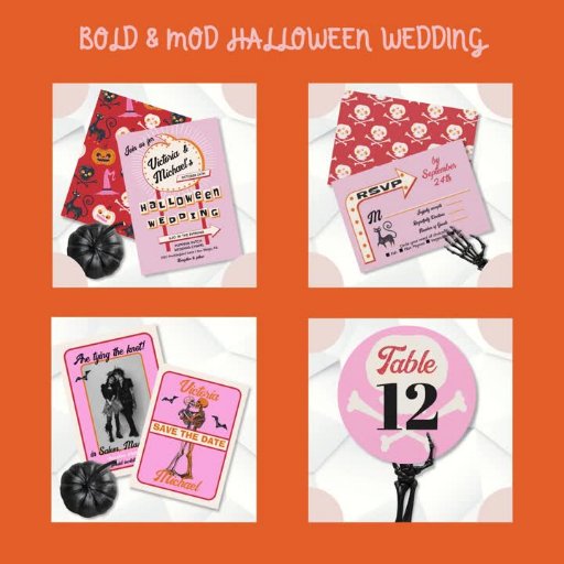 Halloween Trouwvormig teken en leuke lettertypen met een mod retro vibe. Beschikt over een pompoen teken met funky kleuren van roze, rood, sinaasappel, zwart en zeer licht romig wit. Perfect voor een Halloween thema bruiloft! Alle bewoordingen kunnen worden gewijzigd behalve het woord "HALLOWEEN WEDDING". Ga naar Deze sjabloon personaliseren om meer wijzigingen aan te brengen. Onderaan zie je "Wilt u dit ontwerp nog verder aanpassen? Klik op het GEREEDSCHAP BEWERKEN met de ontwerpfunctie. Het zal wat leren vergen maar u kunt sommige doopvonten & sommige kleuren veranderen, dingen rond bewegen of schrappen wat u nodig hebt. Je krijgt het wel onder de knie.